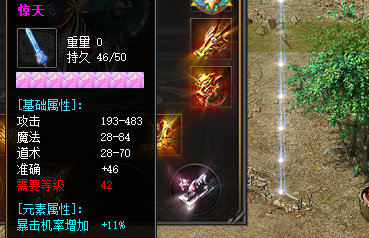 如上游戏截图所示,这件装备在攻击上是193-483点属性,在魔法上面是28-84点,在道术上面是28-70点属性,在准确上面+46点准确度,需要玩家穿戴等级为42等级,在暴击元素上面+11%暴击元素。